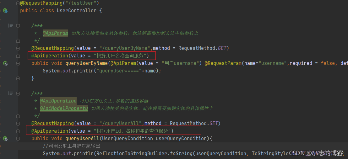 2、@ApiOperation注解标注在了控制层的UserController类的方法上,如下图画红色框的位置可以看到注解生效。