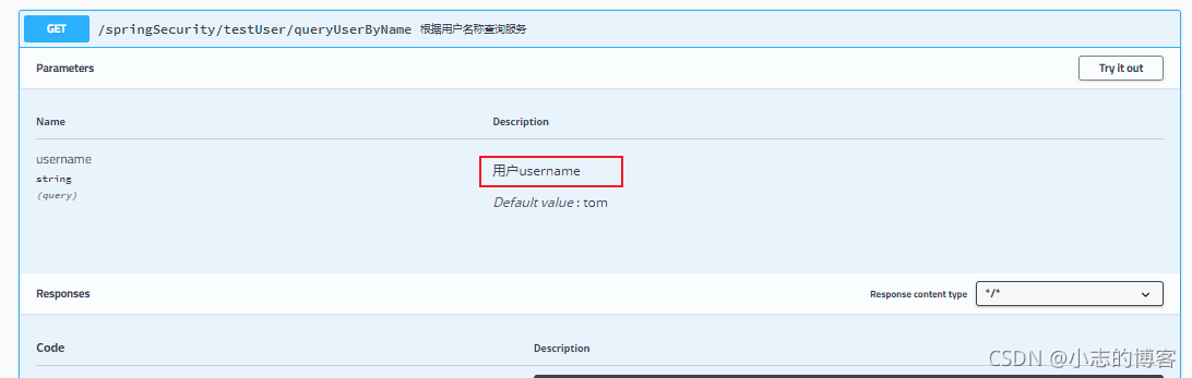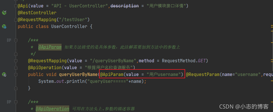 public void queryUserByName(@ApiParam(value = "用户username") @RequestParam(name="username",required = false, defaultValue ="tom" ) String name){