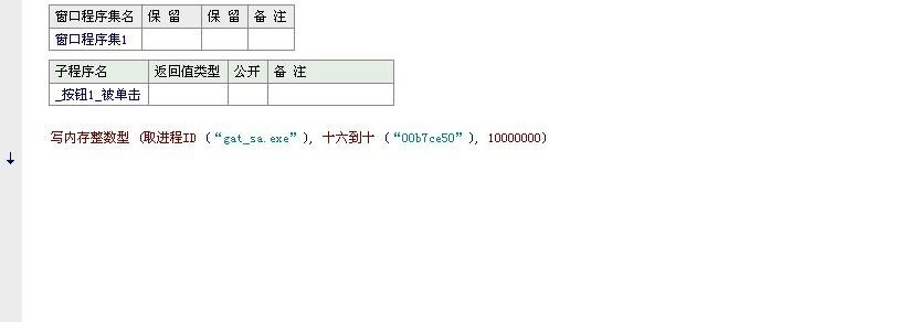 写内存整数型 (取进程ID (“gat_sa.exe”), 十六到十 (“00b7ce50”), 10000000)