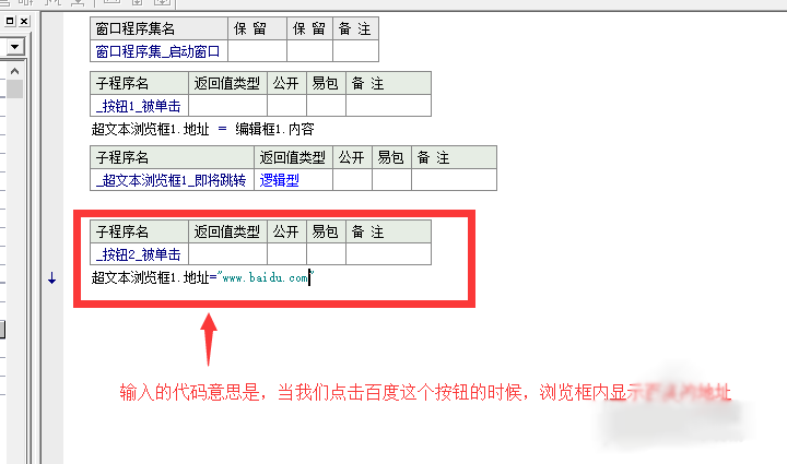 2:在按钮2下面 输入代码 》超文本浏览框1.地址=“www.baidu.com或者你想输入的网站”