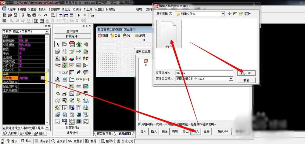 4、将图片组文件导入到工具条组件的图片组中,相关操作如图: