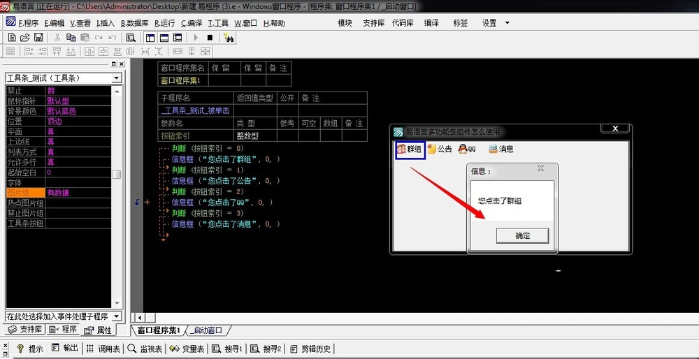 6、代码编写完毕,开始测试程序。猛戳F5键运行程序,点击工具条组件按钮,查看程序变化: