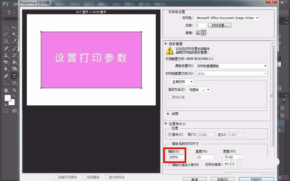 9、接下来就是位置和大小的调节,这个设置图片在纸张的那个位置,都可以进行微调,然后也可以缩放打印尺寸,默认是100%,比如这里调节成200%,图片就会放大一倍,如图所示: