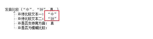 我们输入调试输出 (发音比较 (“中”, “钟”, 真, 假))