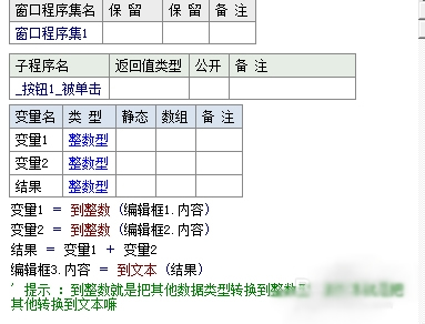8、在_按钮1_被单击下声明了3个变量,变量1 = 到整数 (编辑框1.内容)像这样的代码,这过程叫赋值,就是把编辑框1.内容赋值给变量1,这样变量1里面就有了编辑框1的内容在_按钮1_被单击下声明了3个变量,变量1 = 到整数 (编辑框1.内容)像这样的代码,这过程叫赋值,就是把编辑框1.内容赋值给变量1,这样变量1里面就有了编辑框1的内容