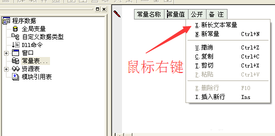 然后在易语言中新建一个文本常量,把复制到的内容粘贴到“常量值”里面去。