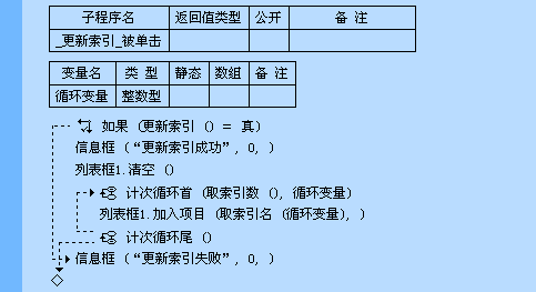 打开数据库的同时,打开2个索引文件。“更新索引”按钮被单击后,运行“更新索引()”命令,成功更新索引后,将当前打开的索引显示在列表框中。