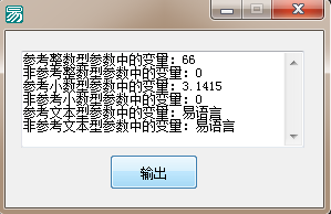 .版本 2 .程序集 窗口程序集1 .子程序 _显示按钮_被单击 .局部变量 整数变量1, 整数型 .局部变量 整数变量2, 整数型 .局部变量 小数变量1, 小数型 .局部变量 小数变量2, 小数型 .局部变量 文本型变量1, 文本型 .局部变量 文本型变量2, 文本型 参数赋值 (整数变量1, 整数变量2, 小数变量1, 小数变量2, 文本型变量1, 文本型变量2) 编辑框1.加入文本 (“参考整数型参数中的变量:” + 到文本 (整数变量1) + #换行符, “非参考整数型参数中的变量:” + 到文本 (整数变量2) + #换行符, “参考小数型参数中的变量:” + 到文本 (小数变量1) + #换行符, “非参考小数型参数中的变量:” + 到文本 (小数变量2) + #换行符, “参考文本型参数中的变量:” + 到文本 (文本型变量1) + #换行符, “非参考文本型参数中的变量:” + 到文本 (文本型变量2) + #换行符) .子程序 参数赋值, , , 此子程序,参数数据是由此子程序内部赋值,则应该注意参数的参考属性,如果传递的数据是整数数据,未选择参考属性,则不传递原数据地址,此时的参数赋值给变量 为0 .参数 参考_整数型参数, 整数型, 参考, 传递原数据地址 .参数 非参考_整数型参数, 整数型, , 不传递原数据地址 .参数 参考_小数型参数, 小数型, 参考, 传递原数据地址 .参数 非参考_小数型参数, 小数型, , 不传递原数据地址 .参数 参考_文本型参数, 文本型, 参考, 传递原数据地址 .参数 非参考_文本型参数, 文本型, , 传递原数据地址 参考_整数型参数 = 66 ' 将传递原数据地址 非参考_整数型参数 = 66 ' 不传递原数据地址 参考_小数型参数 = 3.1415 ' 将传递原数据地址 非参考_小数型参数 = 3.1415 ' 不传递原数据地址 参考_文本型参数 = “易语言” ' 将传递原数据地址 非参考_文本型参数 = “易语言” ' 将传递原数据地址