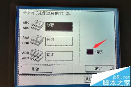 3、进去以后我们可以看到有三个可以选择的选项分别是”分套“、”分组“、”装订“,右侧写着“偏移”,这个偏移指的是出来的文件分套或者分组之后是通过材料之间的偏移来区分的。