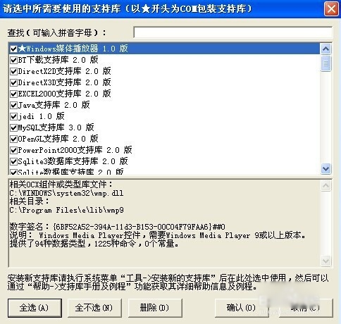 4、安装完后,我们打开易语言,选择菜单栏“工具”下面的“支持库配置”,我们全选,确认即可。