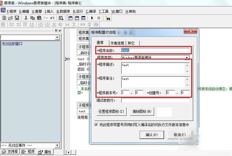 3、开始“实兵演练”,可通过单击鼠标右键弹出菜单并选择“新建子程序”或者按下Ctrl+N键的方式来新建子程序,今天我们就新建一个名叫“test”的子程序,这里有必要说一下相关注意事项:(1)子程序的名字要唯一(2)根据子程序的需要,设置返回值的数据类型,如果无返回值,可留空。(3)设置子程序的公开属性,模块是方便其他程序猿调用的,所以公开要打勾。(4)为了便于程序的开发编写,做好备注是个好习惯。提示自己及其他人此子程序的功能是什么。接下来,就是写代码了,我们就以信息框为例!写完代码记得将公开打“√”和添加备注。