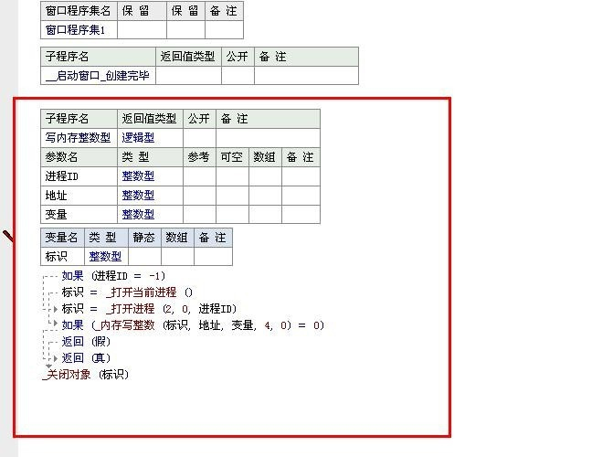 .版本 2 .DLL命令 _打开当前进程, 整数型, , "GetCurrentProcess", , kernel32.dll 打开当前进程伪句柄 .DLL命令 _打开进程, 整数型, , "OpenProcess", , kernel32.dll .参数 访问级别, 整数型, , 2035711完全访问 .参数 子进程继承, 整数型, , 0为子进程继承 .参数 进程ID, 整数型, , 要打开的进程标识 .DLL命令 _内存写整数, 整数型, , "WriteProcessMemory", , kernel32.dll .参数 hProcess, 整数型 .参数 pBaseAddress, 整数型, , 内存地址 .参数 lpBuffer, 整数型, 传址, 数据指针 .参数 nSize, 整数型, , 长度 .参数 lpNumberOfBytesWritten, 整数型, , 实际写出长度 .DLL命令 _关闭对象, 整数型, , "CloseHandle", , kernel32.dll .参数 对象句柄, 整数型