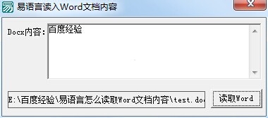 1、首先,为了配合此次程序测试,我们事先准备好一个Word文件即Docx文件,为了使得软件能正确读取出其中内容,我们在Word文件中,输入“百度经验”作为测试标示。如图: