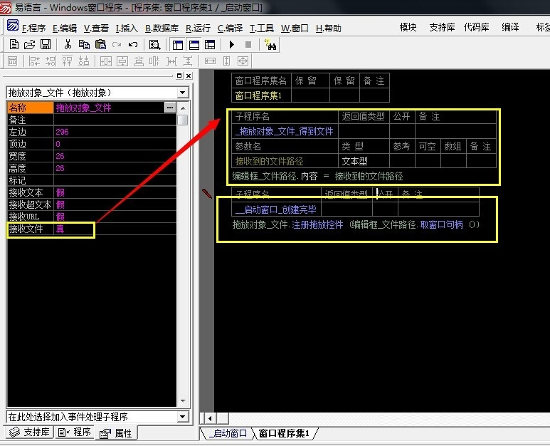 5、然后,就进入代码编写阶段了。首先,需要注册一下拖放对象,然后将拖放对象的“接收文件”属性设置为真,接着,编写如下代码: