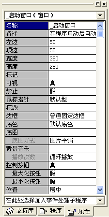 请跳转到程序窗口设计界面(双击左侧程序子夹中的“_启动窗口”)。点击窗口中的按钮,在属性表中可以看到其名称为“按钮1”,单击属性表底部显示为“在此处选择加入事件处理子程序”的组合框。