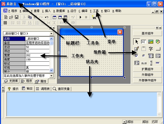 前面已说过了如何启动易语言,只要双击易语言快捷方式即可。下面,让我们来看看易语言的界面吧。