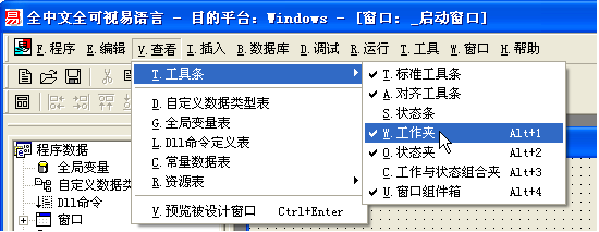 菜单中列出了易语言的功能命令,通过菜单可完成诸如打开易程序,保存易程序等功能。