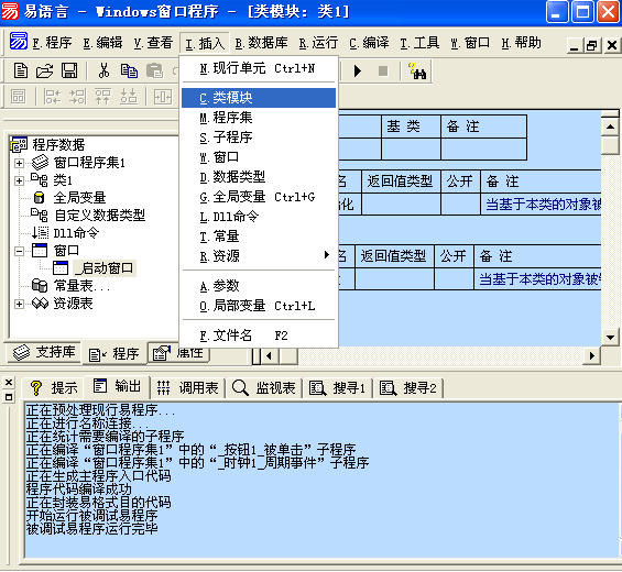 易语言中,可以通过菜单“插入”→“类模块”来创建类,如图所示: