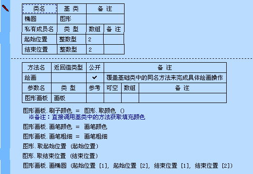 可以看到“图形”类中的“取颜色()”和“取结束位置()”方法,没有设置“公开”属性,所以在基于“椭圆”(“图形”类的派生类)的对象被创建后,没有公开的方法即被隐藏起来了。