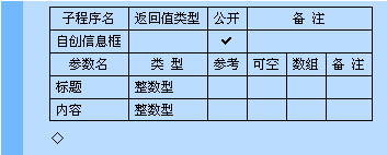 修改一下子程序名称,叫“自创信息框”,然后创建2个参数“标题”和“内容”,都定义成整数型,如下图所示: