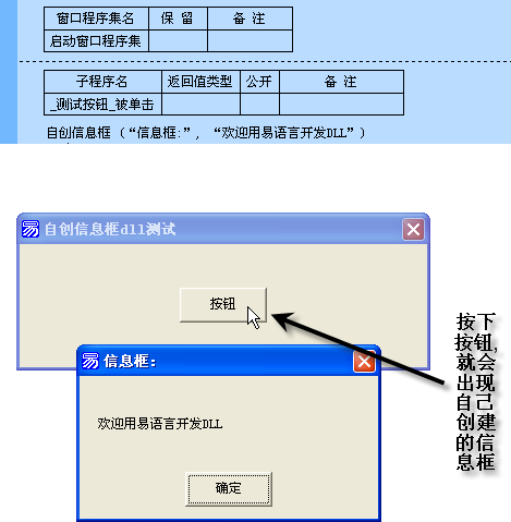 易语言中的DLL编写方法和易模块的编写方法类似,都需要有对外的公开接口。下面将通过编写一个“自创信息框”来看一下用易语言如何编写和调用DLL。