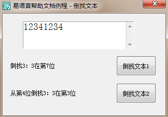 语法: 整数型 倒找文本 (被搜寻的文本,欲寻找的文本,[起始搜寻位置],是否不区分大小写)