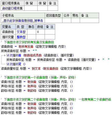 以上就是玩命电话最近收集整理的关于易语言获取汉字发音数目和拼音并取声母和韵母的全部内容,更多相关易语言获取汉字发音数目和拼音并取声母和韵母内容请搜索靠谱客的其他文章。