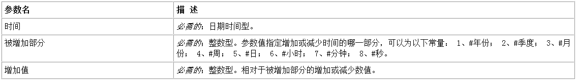 语法: 日期时间型 增减时间 (时间,被增加部分,增加值)