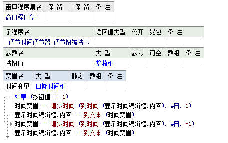 用一个调节钮组件来控制编辑框中的时间,当上调节钮被按下,编辑框中时间的“日”部分就增加1,下调节钮被按下,编辑框中时间“日”部分就减1。用“增减时间”命令控制时间增减,会按照日期时间的特点自动改变年月日,例如当“日”部分超过本月最后一天,“月份”部分会自动进位。