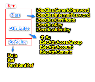 钥匙串中的条目都有几个可搜索的**属性**和一个加密过的**值**。对于通用密码条目,比较重要的属性有账户(kSecAttrAccount)、服务(kSecAttrService)和标识符(kSecAttrGeneric)。而值通常是密码。