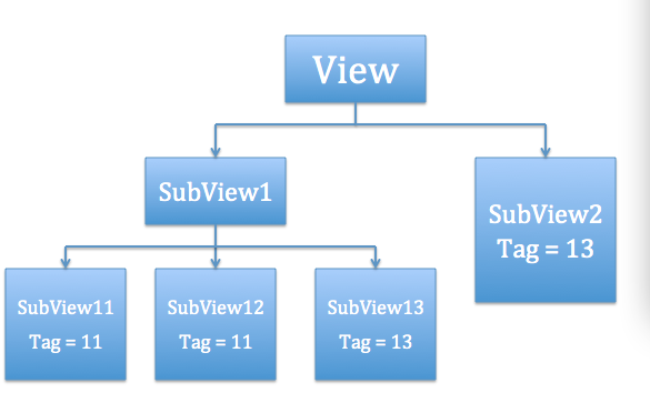 首先我在subview1中添加了两个tag都为11的subview11和subview12。 运行程序可以,当我们点击"Show Tag 11"按钮的时候屏幕上将显示“SubView11”,而非“SubView12”。同时不管你点击几次该按钮,始终只显示“SubView11”。这样可以看出来同一层级中获取subview时候查找顺序为index从小到大的原则,即位于相对下层的将首先被找到。