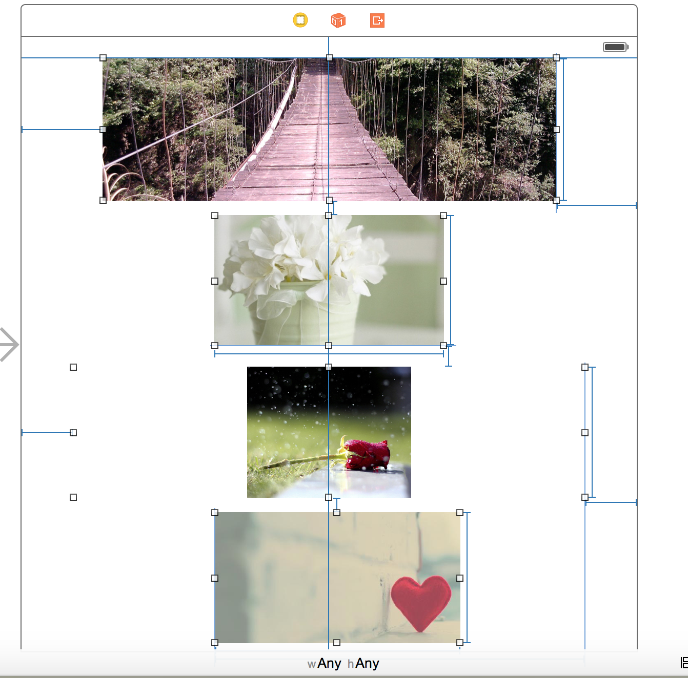 创建一个测试工程,在ViewController上添加4个不同尺寸的UIImageView, 并且添加上不同的约束,最后添加上不同的文艺小清新的图片,最终Storyboard上的控件和约束如下所示。