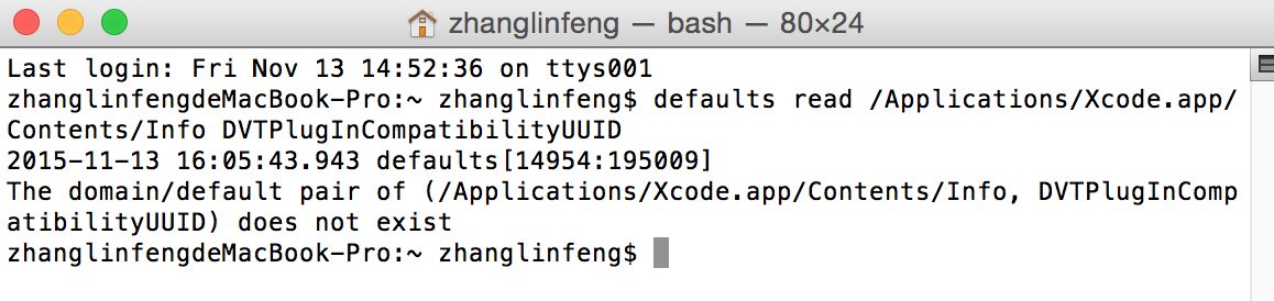 在终端执行defaults read /Applications/Xcode.app/Contents/Info DVTPlugInCompatibilityUUID,会得到一串 UUID 码。可能你的Xcode不是你安装的,而是直接拷贝别人安装好的Xcode到你的应用程序中,那么这个命令得不到Xcode的uuid,会出现如下图的问题: