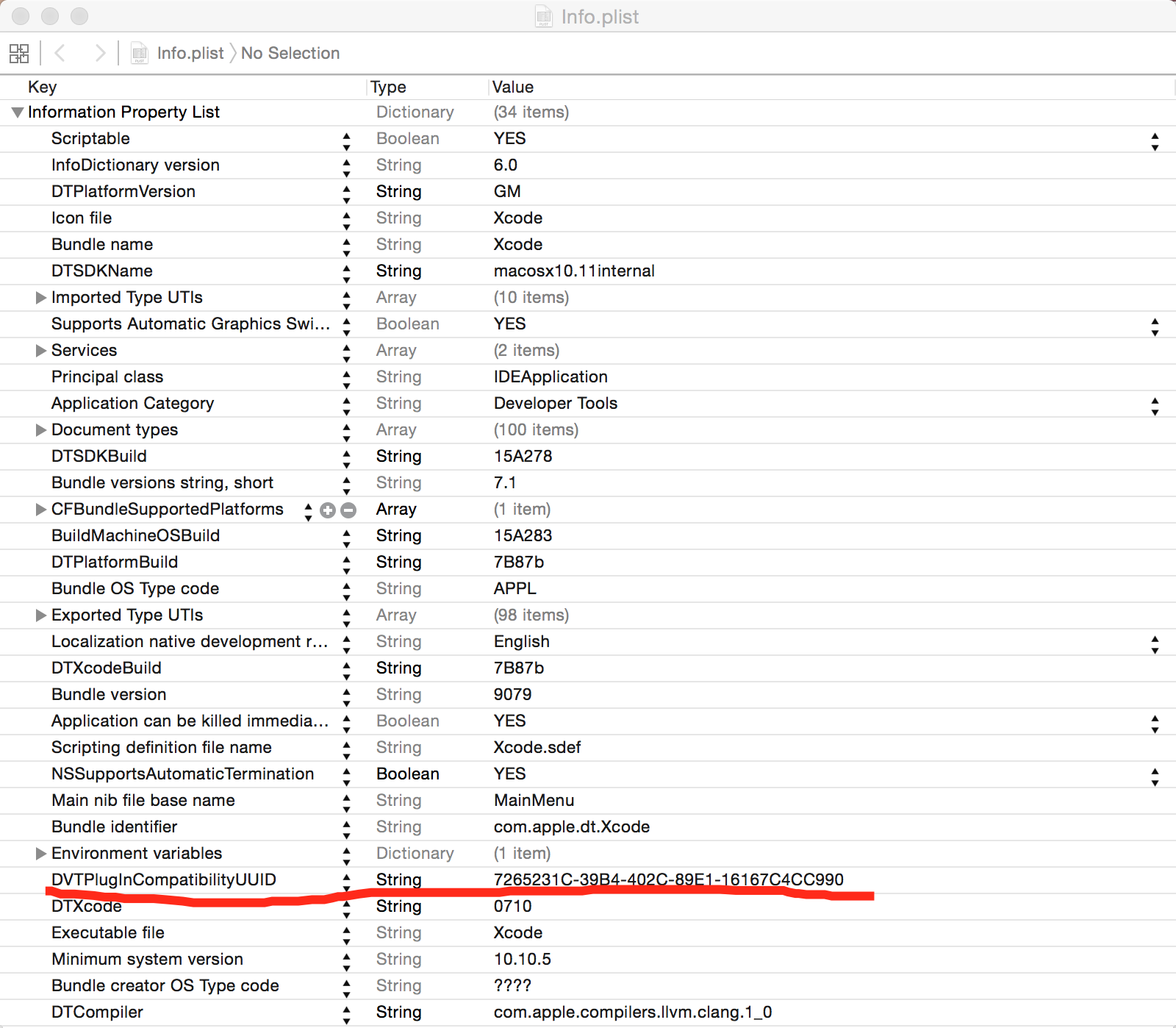 另外一种办法也能得到Xcode的uuid,在应用程序中找到Xcode,右键选择显示包内容,找到Info.plist文件打开找到DVTPlugInCompatibilityUUID对应的值就是我们要的uuid