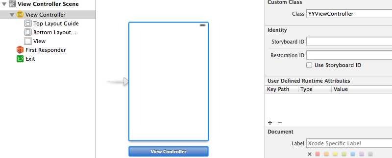 2.设置这个控制器和程序中的YYviewController类进行关联,设置控制器view的颜色以便区分。