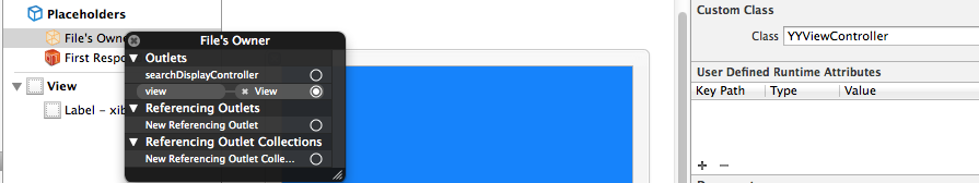 解决方法:设置File‘s Owner,可以理解为设置这个文件归谁所有,对File‘s Owner和view进行连线。连线是因为一个xib中可能会有多个view,在storyboard中默认就已经进行了连线。