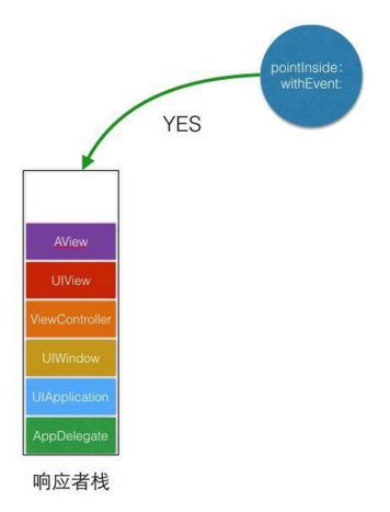 不仅如此,从上面输出的nextResponder来看,所有的响应者都是在查找中返回可响应点击的视图。因此,我们可以推测出UIApplication对象维护着自己的一个响应者栈,当pointInSide: withEvent:返回yes的时候,响应者入栈。