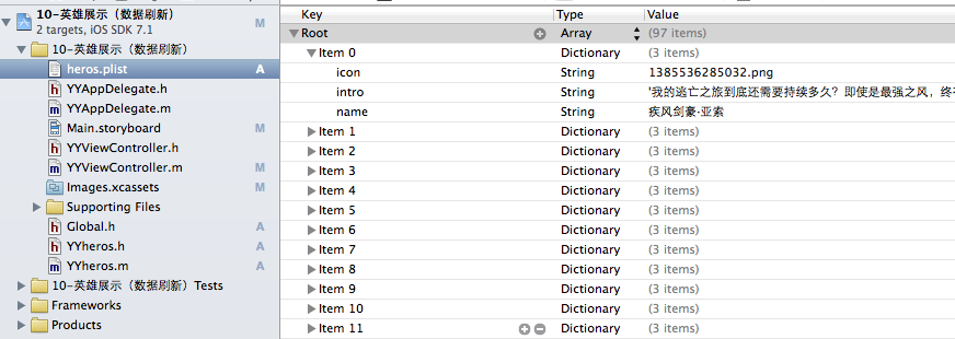 1.多少组数据和显示多少行通常是和数据息息相关的,在开发中数据通常存储在plist文件中,需要以一定的方式加载到项目中(模型)。