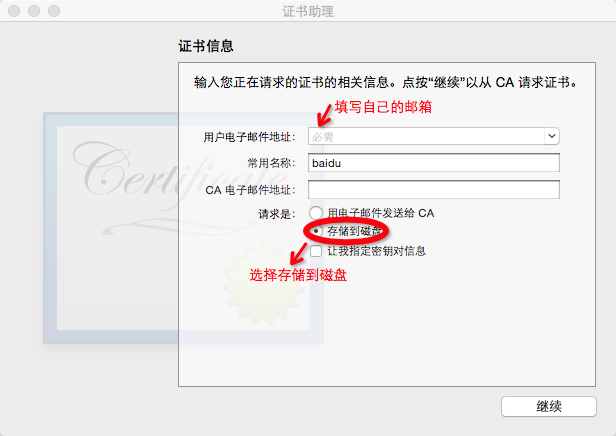 到了这里,需要停下制作 CSR 文件,制作过程比较简单,下面是制作的过程。打开 Mac 系统软件'钥匙串访问',选择 '证书助理' 及 '从证书颁发机构请求证书',制作 CSR 文件,如下图: