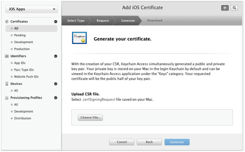 生成证书后,返回到 “About Creating a Certificate Signing Request (CSR)” 的界面,点击 continue,然后在 “Choose File” 选择生成的CSR文件,最后点击 Generate,生成证书。如下图: