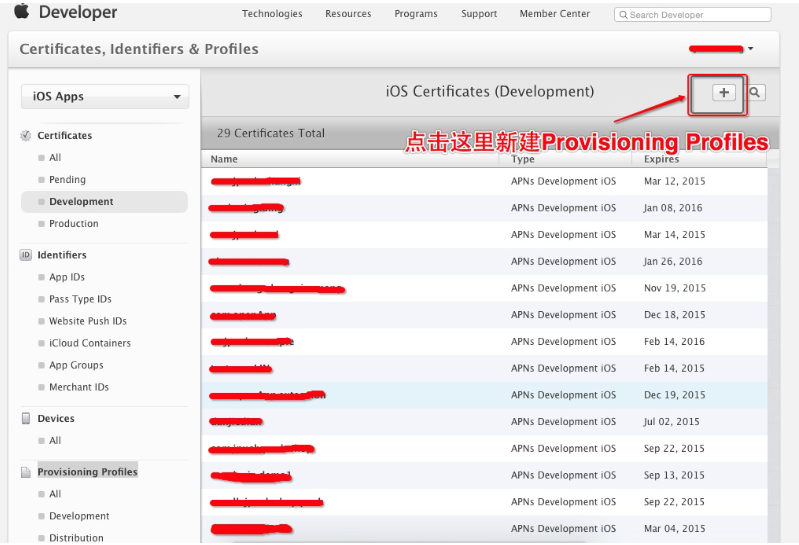 首先登陆 iOS Dev Center ,然后进入 Member Center,然后选择 Certificates,Identifiers & profiles,如下图: