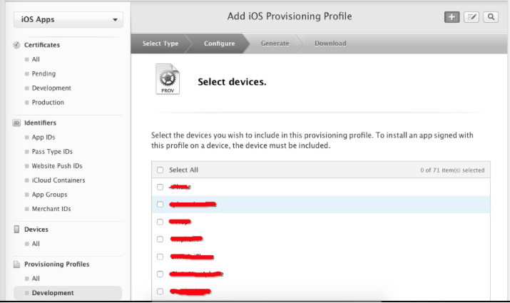 选择创建profile的appid和开发者证书,并选择设备,最后生成profile