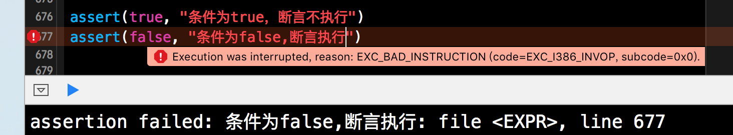 在assert()函数中, 第一个参数是Bool类型,第二个参数是输出的信息。当条件为true时,断言不执行,相应的断言信息不打印。当条件为false时,断言执行,并且打印相应的断言信息。