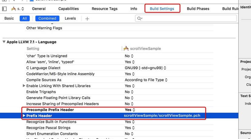 1.pch需要提前编译,在工程文件中,找到Build Setting,选择All选项,中找到 Apple LLVM 1.7 - Language集合下的 : Precompile Prefix Header 设置为 Yes ,然后 Prefix Header 选项中写入pch文件的绝对路径,如图: