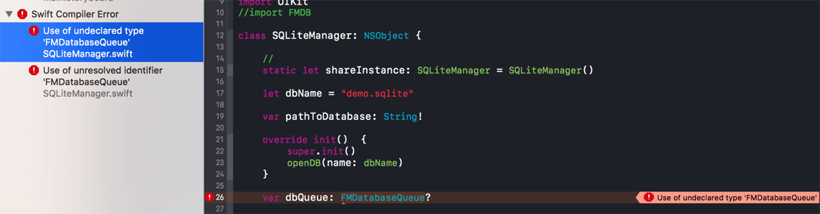 OC项目转Swift,打算继续使用FMDB。Cocoapods进来后,在桥接文件 "XXX-Bridging-Header.h" 中写入#import "FMDB.h"。