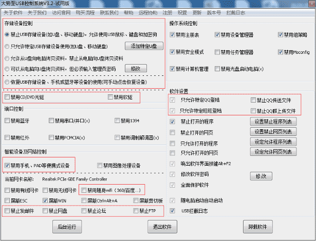 图:屏蔽U盘使用、禁止发邮件、限制网盘上传、禁止FTP传输文件、禁止论坛发帖留言等