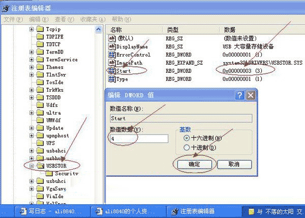 打开注册表编辑器,依次展开如下分支[HKEY_LOCAL_MACHINE\SYSTEM\CurrentCntrolSet\Services\USBSTOR],在右侧的窗格中找到名为“Start”的DWORD值,双击,在弹出的编辑对话框中将其数值数据修改为十六位进制数值“4”。点“确定”按钮并关闭注册表编辑器,重新启动计算机,使设置生效。重启后,当有人将USB存储设备连接到计算机时,虽然USB设备上的指示灯在正常闪烁,但在资源管理器当中就是无法找到其盘符,因此也就无法使用USB设备了。