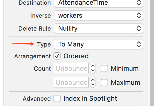前面两个都比较好理解,Inverse需要稍微多说一点点。如果没有反向关系,就选择No Inverse,但是苹果官方建议为了保证数据之间的一致性,最好设置反向关系。