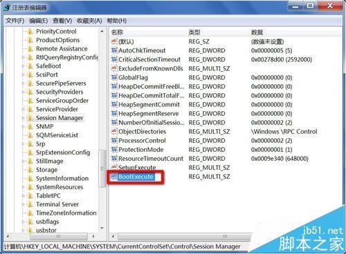 在Session Manager的右侧窗口,找一找,是否有BootExecute这一项,再看看其后面的值是否为autocheck autochk *,如果没有这一项,就必须新建一个。