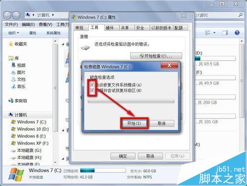 还会弹出一个设置框,有“自动修复文件系统错误”和“扫描并尝试恢复坏扇区”,这两项都要勾选上,然后按“开始”按钮。